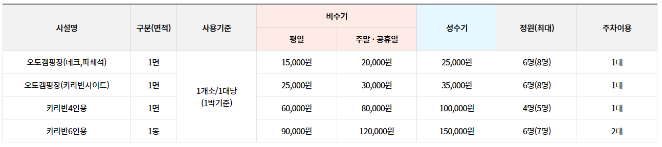 - 오토캠핑장:성인5,000원/청소년3,000원/어린이1,500원
