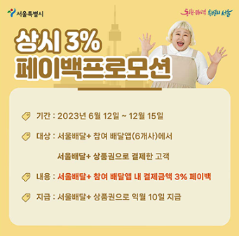 - 내용: 서울배달플러스 참여 배달앱 내 결제금액 3% 페이백