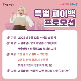- 내용: 서울배달플러스 참여 배달앱 내 결제금액 3% 페이백