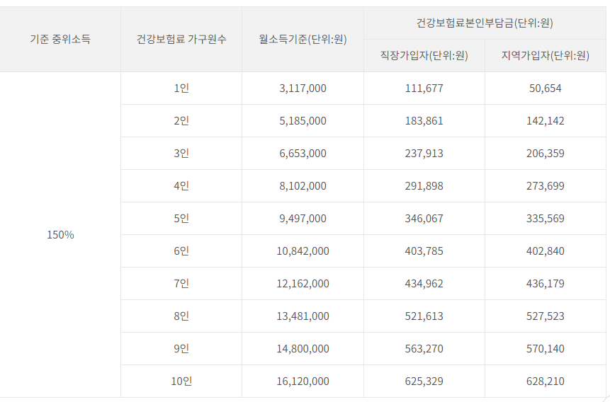 - 신청인이 속한 가구의 건강보험료 고지금액(23년 4월분)이 23년 건강보험료 소득판정 기준표상 기준 중위소득 150%의 건강보험료 본인부담금 이하여야 함