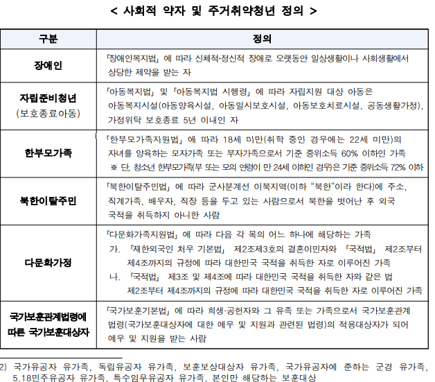 | 사회적 약자 및 주거취약청년 - 사회적 약자: 장애인, 자립준비청년(보호종료아동), 한부모가족, 북한이탈주민, 다문화가정, 국가보훈관계 법령에 따른 국가보훈대상자 -주거취약청년:(반)지하·옥탑방·고시원 거주 청년 |