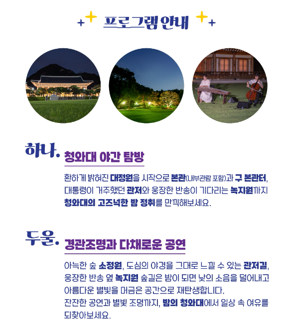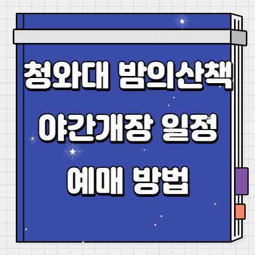 청와대 국민들에게 오픈되고 관심이 많았죠. 이번에는 청와대에서 밤의 산책이라는 야간 행사를 진행한다고 합니다. 사전예매를 통해서 입장이 가능하다고 하는데요. 사전예매 방법과 야간개장 일정에 대해 알려드리도록 하겠습니다. 바로 확인해 보세요.