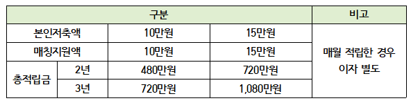 - 예) 월 15만원씩 3년간 꾸준히 저축할 경우, 만기 시 본인 저축액 540만 원에서 서울시의 지원액 540만 원을 더한 1080만 원과 이자를 지급받을 수 있음.